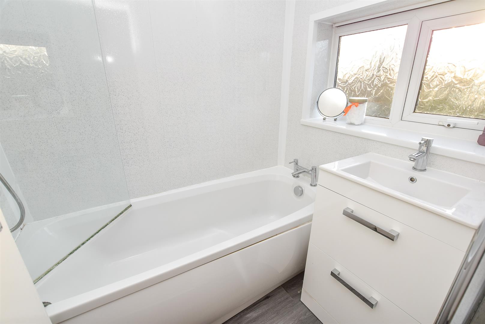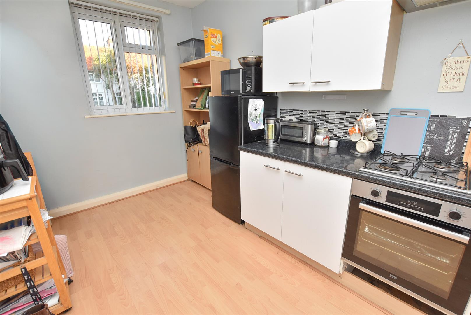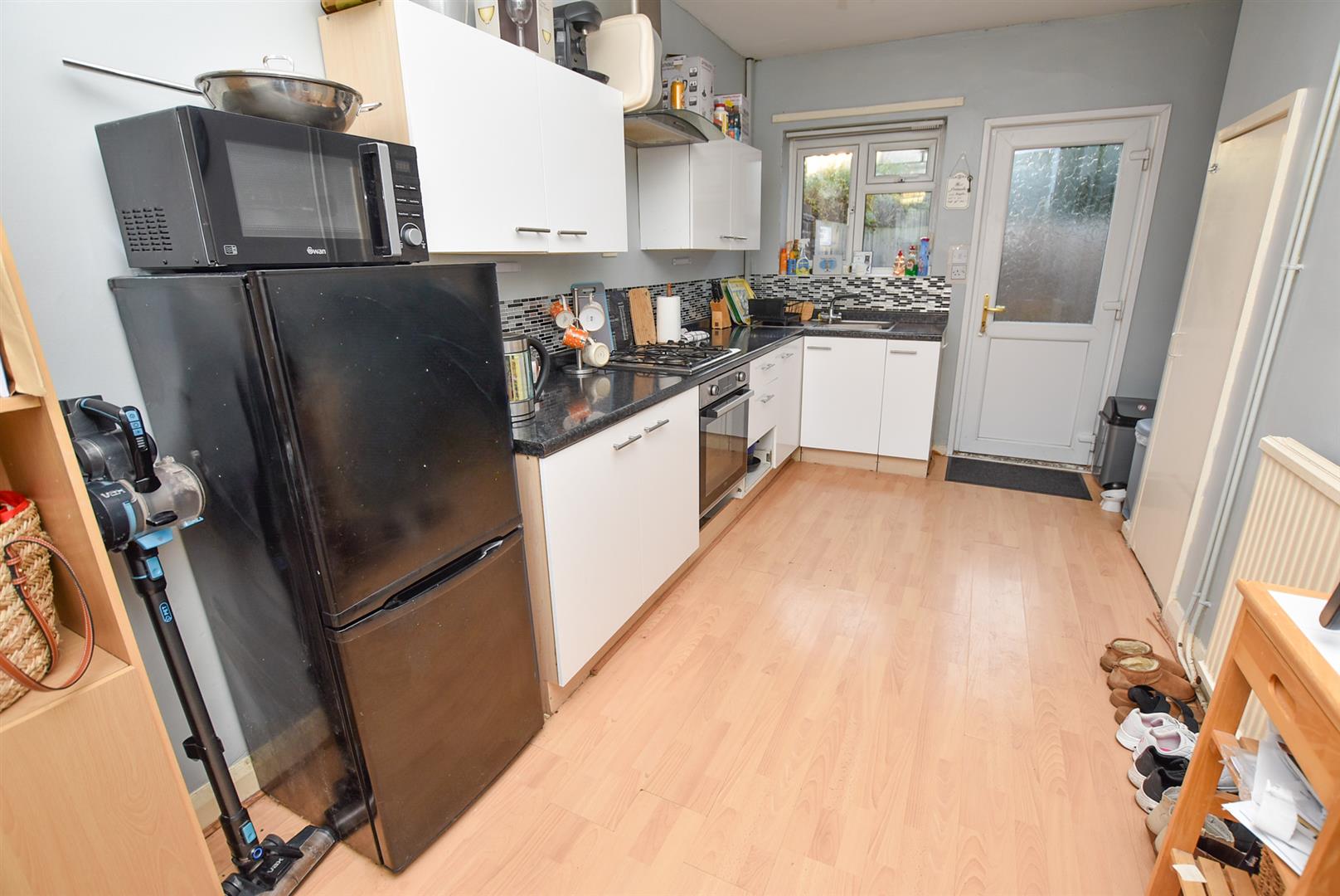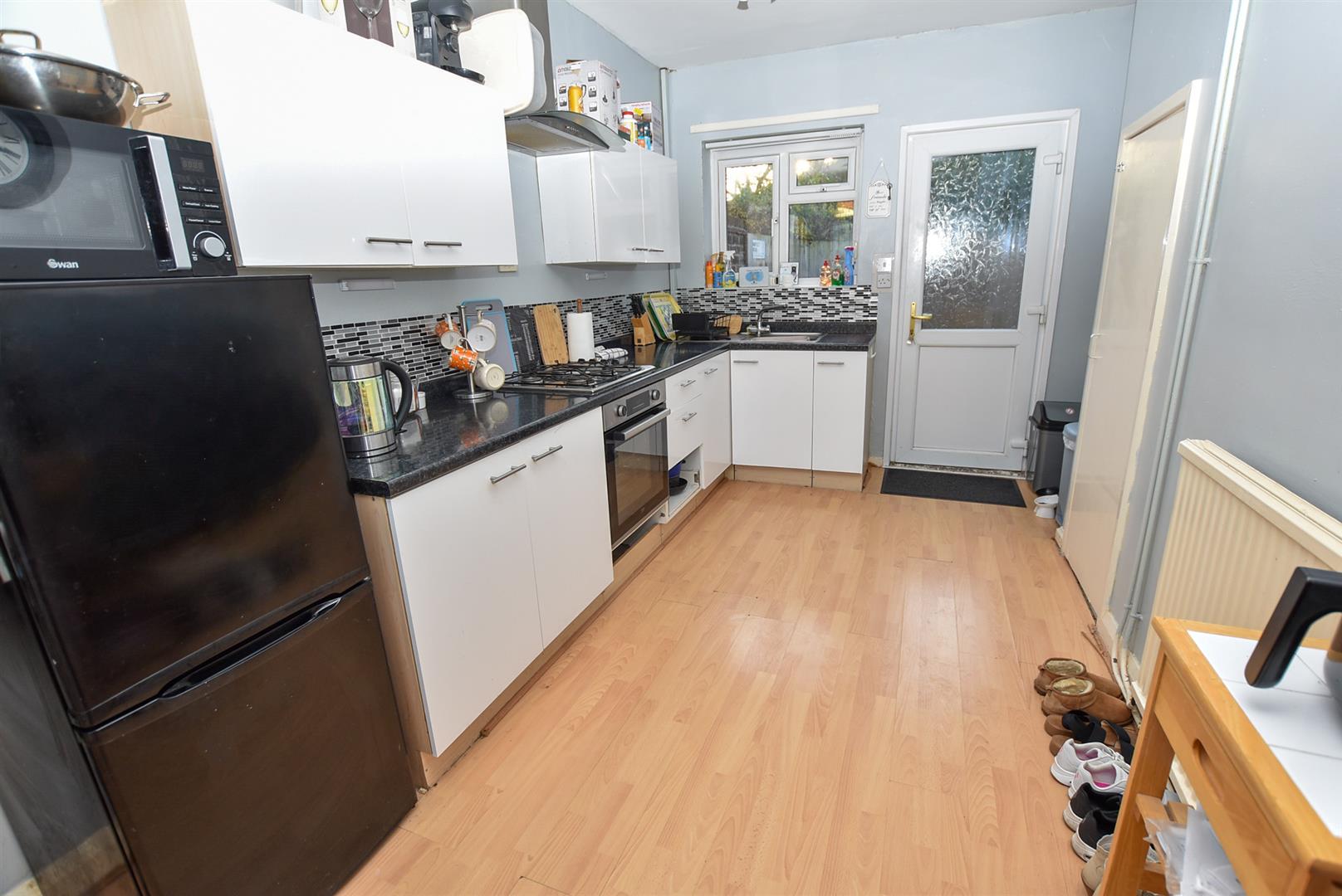 The breakfast kitchen can be found on the left hand side of the hallway and offers a range of wall and base units finished in white complimentary work top, space for appliances, under stairs store and wall mounted boiler. Aspect and door opening onto the the garden.