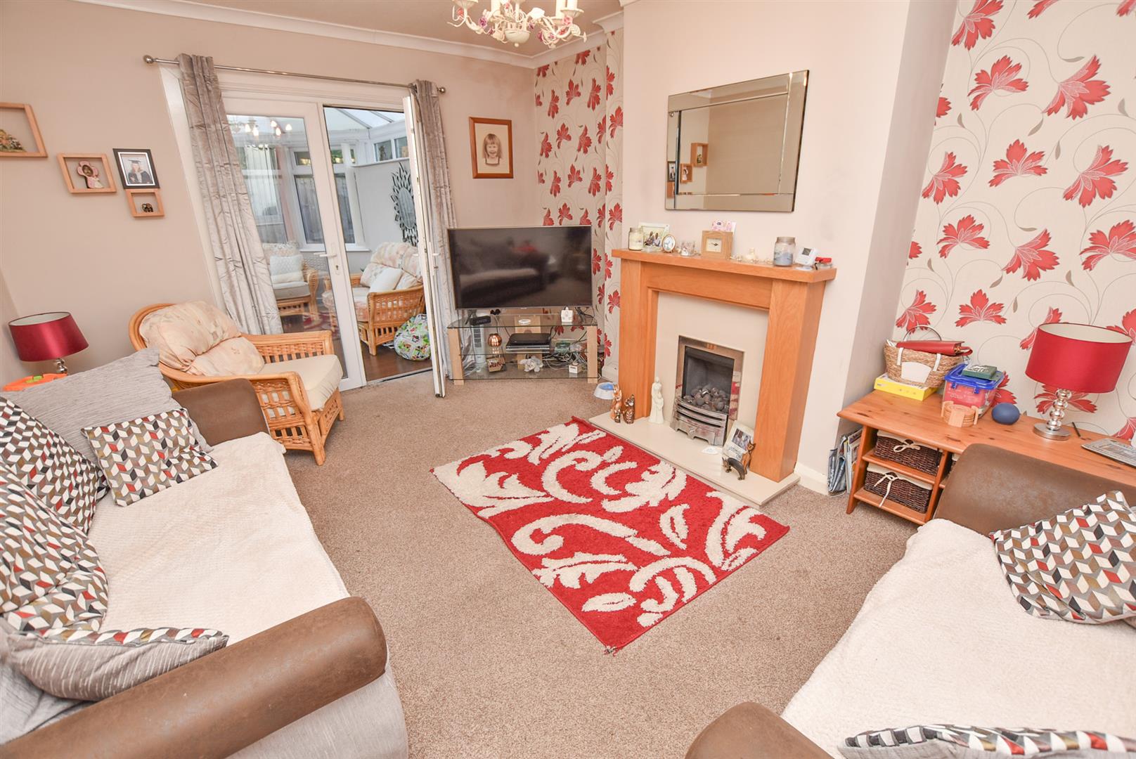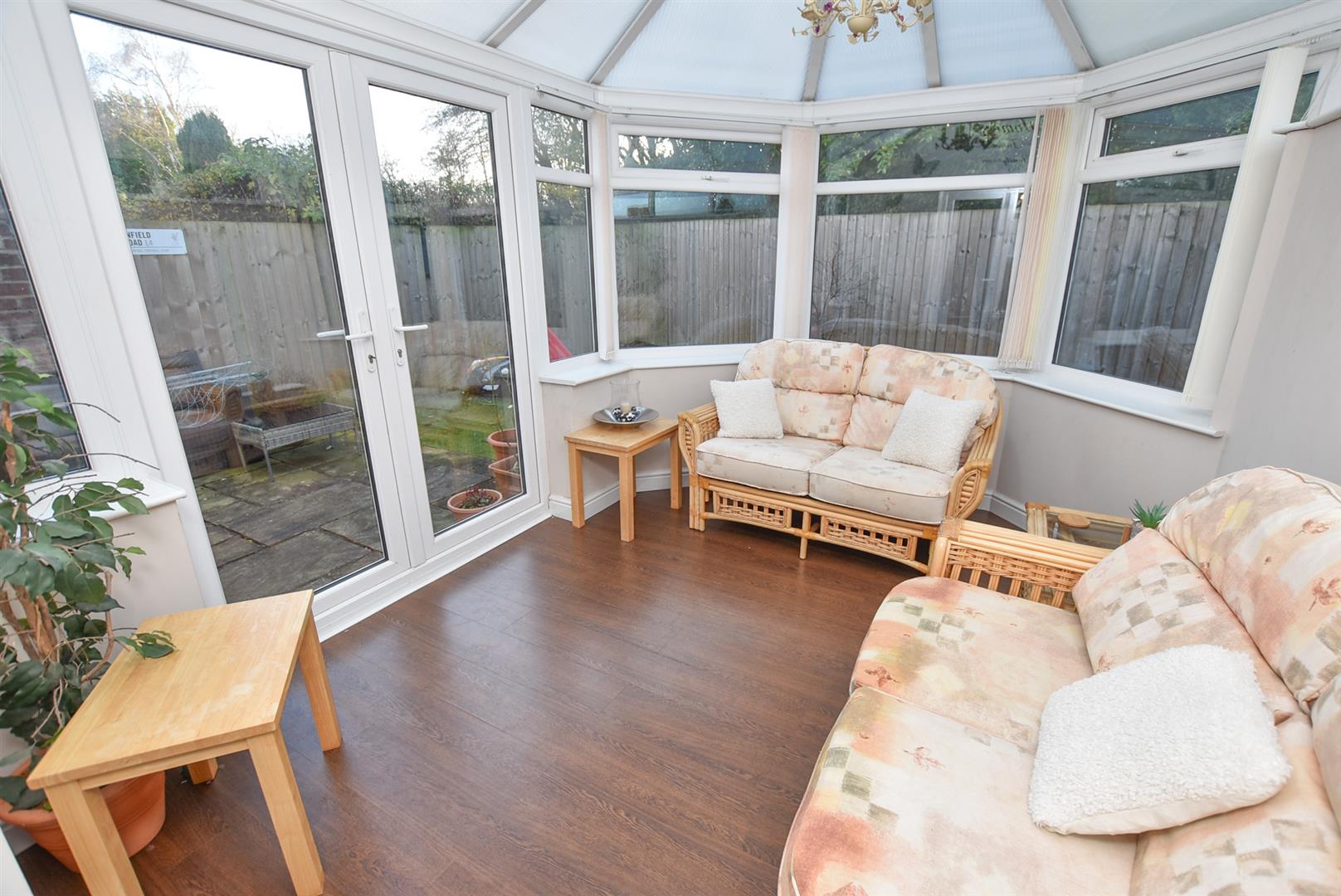 On the right hand side a well proportioned lounge with central fireplace and French doors opening into the Conservatory which provides extra reception space, overlooking the garden with French doors.