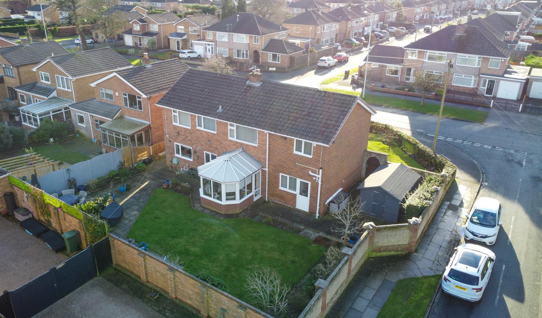 The garden to the rear is private with multiple points of access via the kitchen, conservatory or utility. A paved patio on the right hand side which provides a secluded seating area, whilst the majority is laid to lawn with pathway continuing across the rear. On the left hand side you will find a further patio with space for shed / storage, bins and gated access to the front and brick boundary walls enclose the garden.