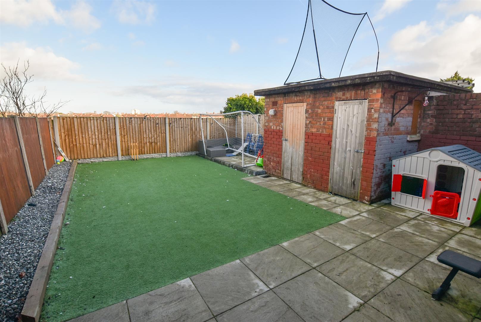 A paved patio area to the immediate rear with access to the side passageway which leads to the front. AstroTurf lawn with railway sleeper and slate border with raised seating area at the rear of the 2 brick built outbuildings. Fence boundaries and open aspect to the rear.