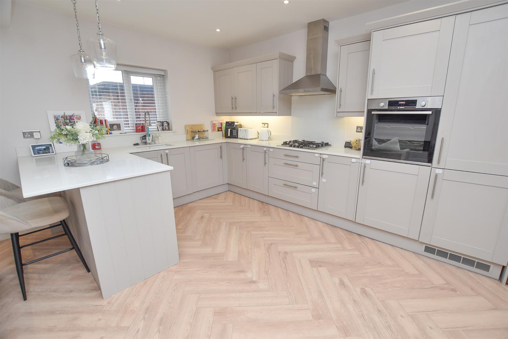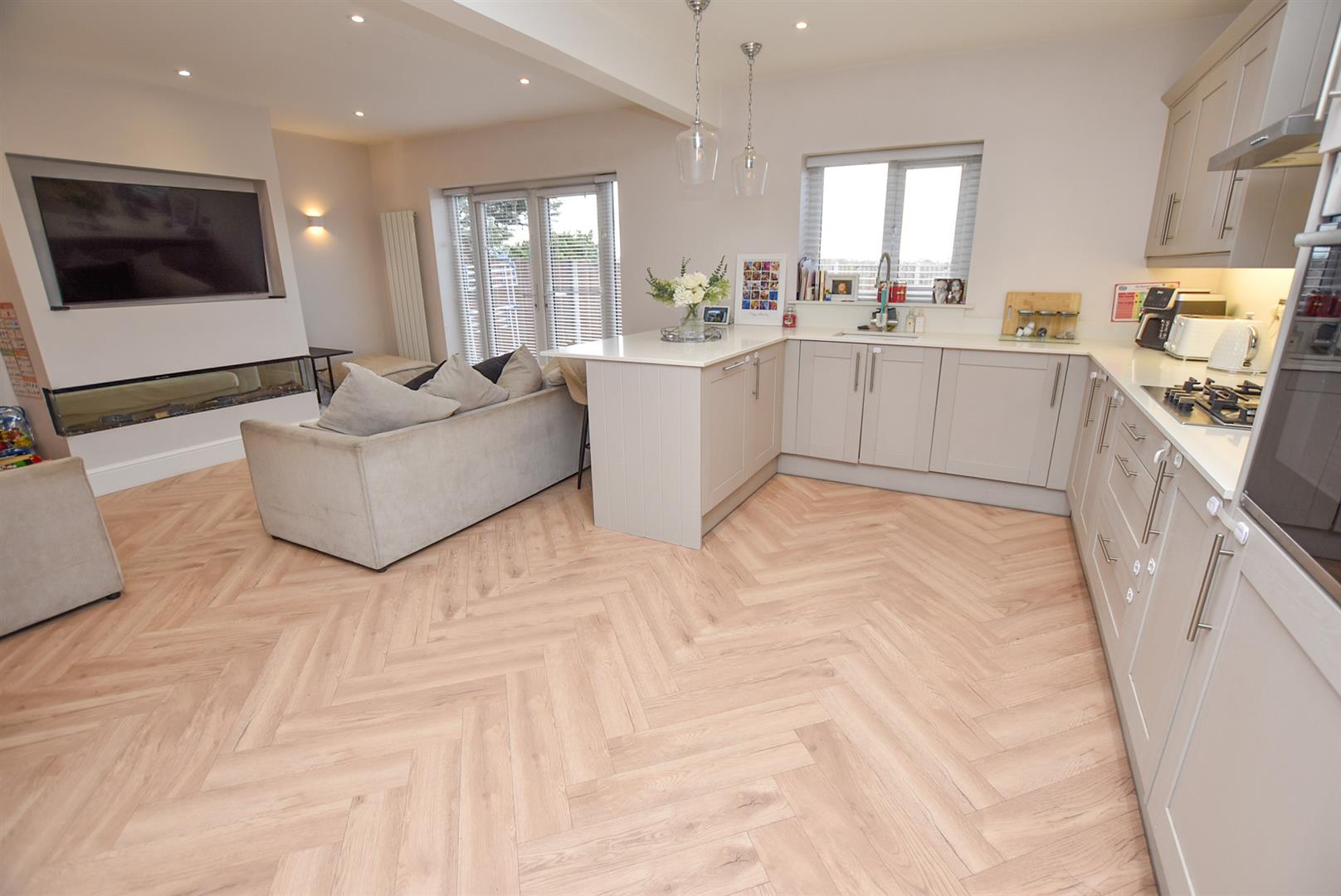 Wow... Natural light, open plan and contemporary decor! On the left you have a living area complete with media wall and inset fire, French doors leading out onto the rear garden and open to the fantastic kitchen which offers a wide range of units, integral appliances and breakfast bar whilst open to the dining area which overlooks the front.